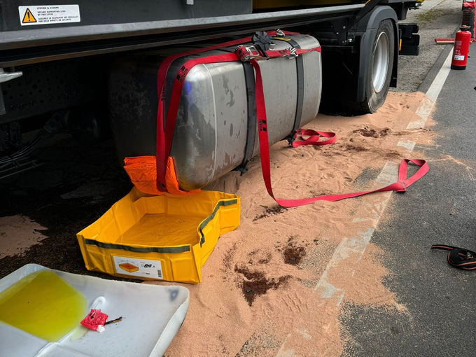 ℹ️ Die ILS Oderland alarmierte uns zu einem LKW, welcher einen Riss im Tank hatte und große Mengen an Diesel verlor. Wir haben zusammen mit den Kräften aus Dahlwitz-Hoppegarten ca. 500m verunreinigte Fahrbahnfläche abgebunden und den Rest-Diesel des LKW in geeignete Behälter umgepumpt.